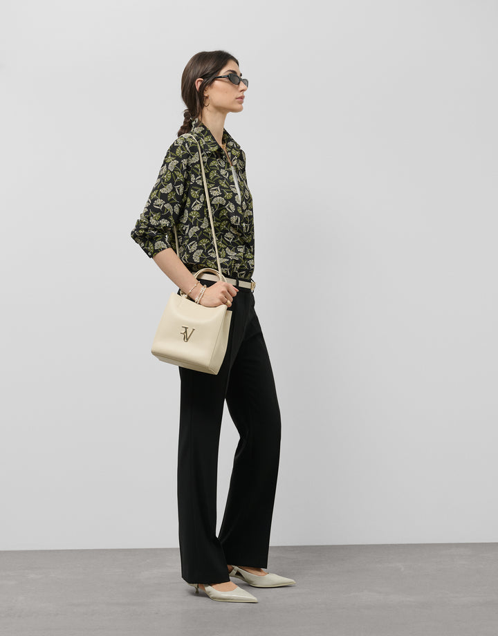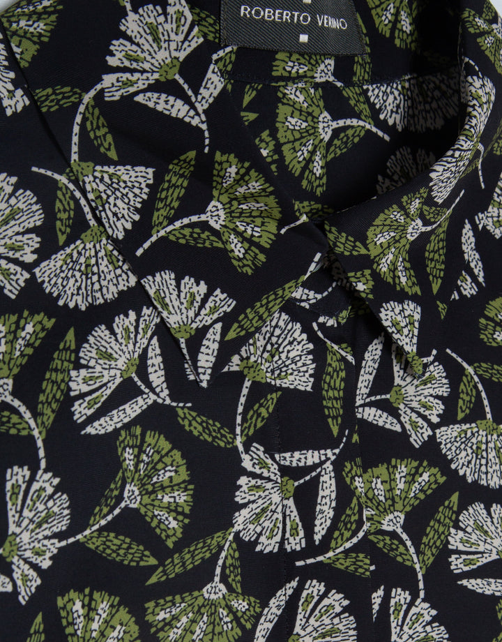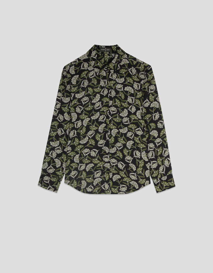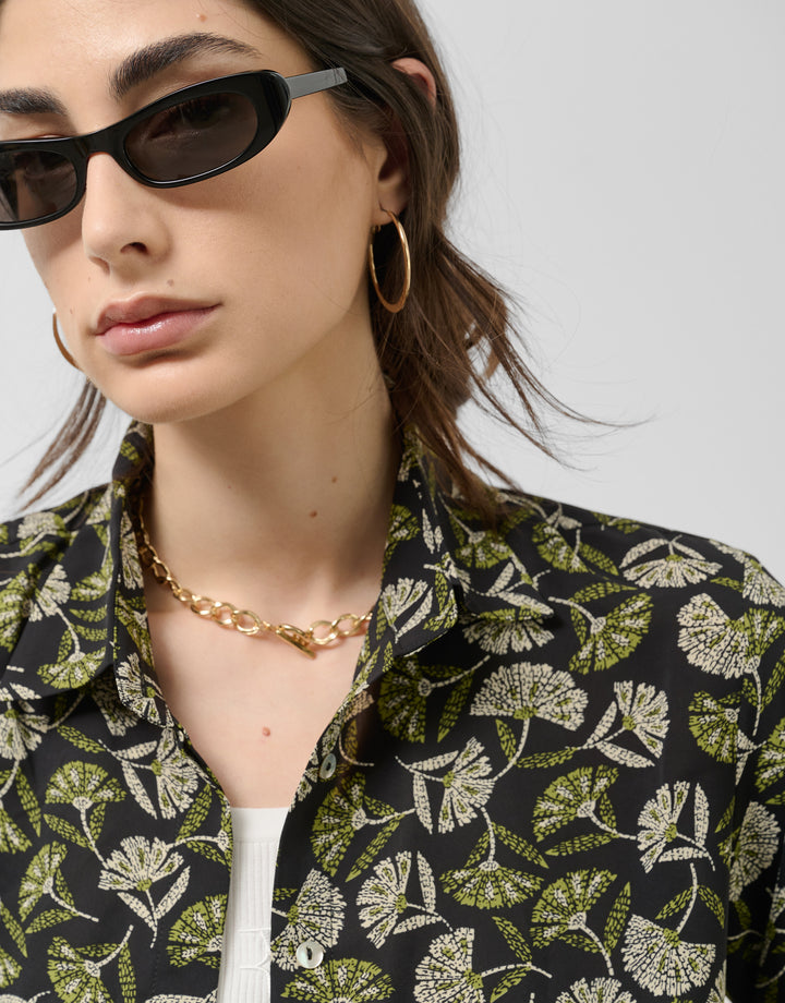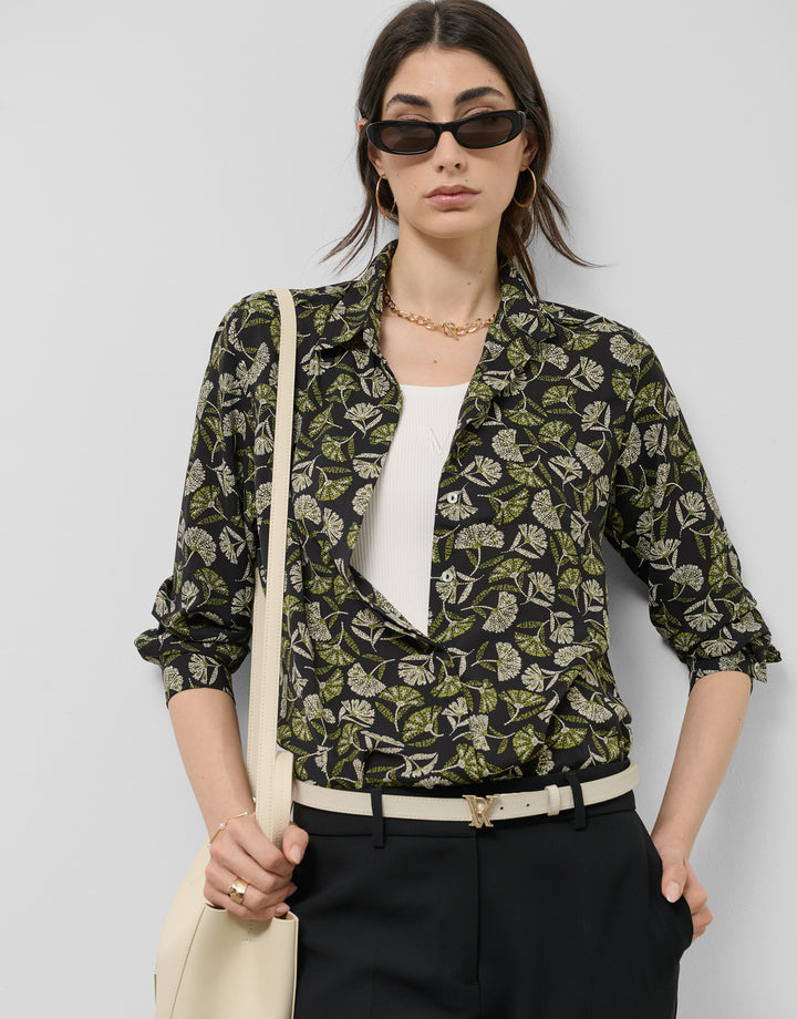 Masculine-cut shirt in black crepe with a green leaf print. It features a shirt collar, back yoke, long sleeves with buttoned cuffs, and a visible button-front closure.