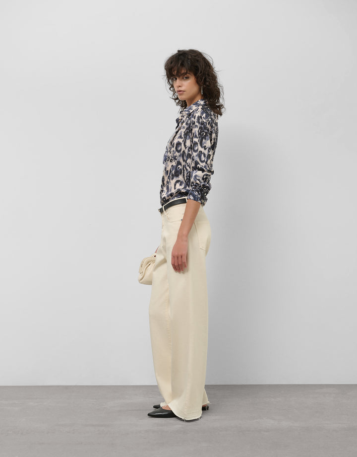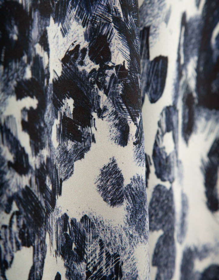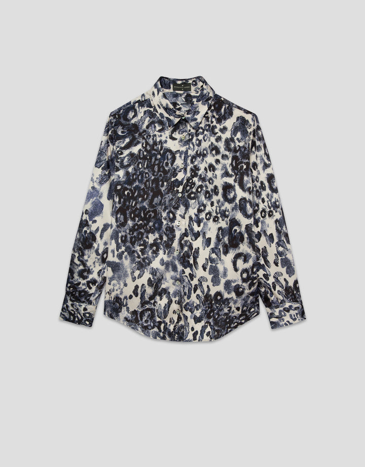 Long-sleeved twill blouse with an animal print design in navy blue. Shirt collar, long sleeves with cuffs, and visible button closure at the front.