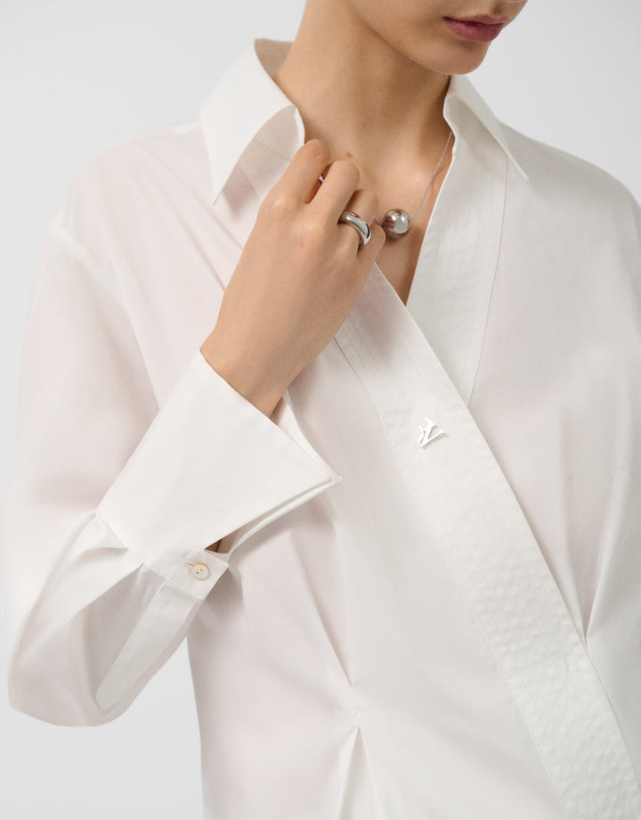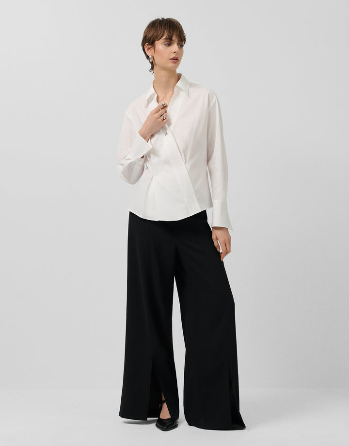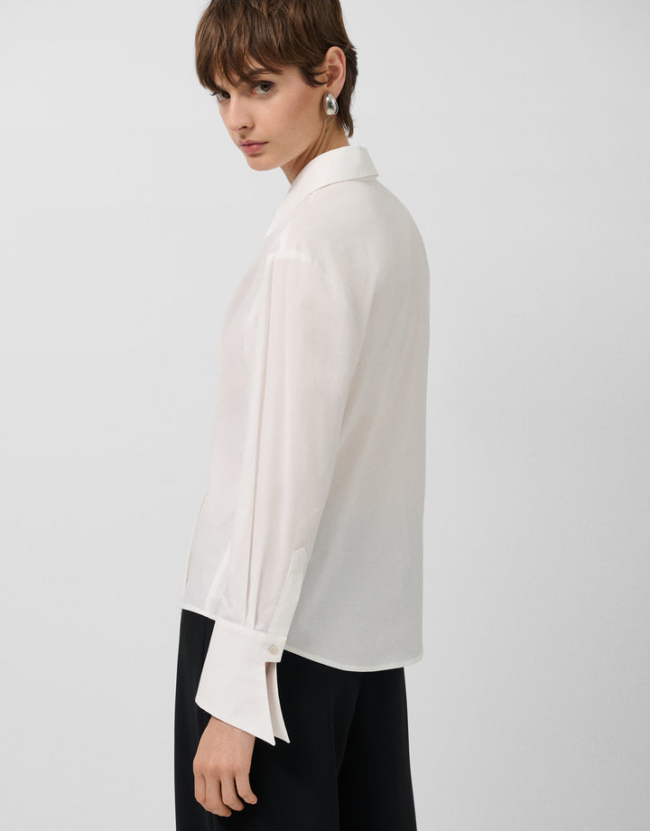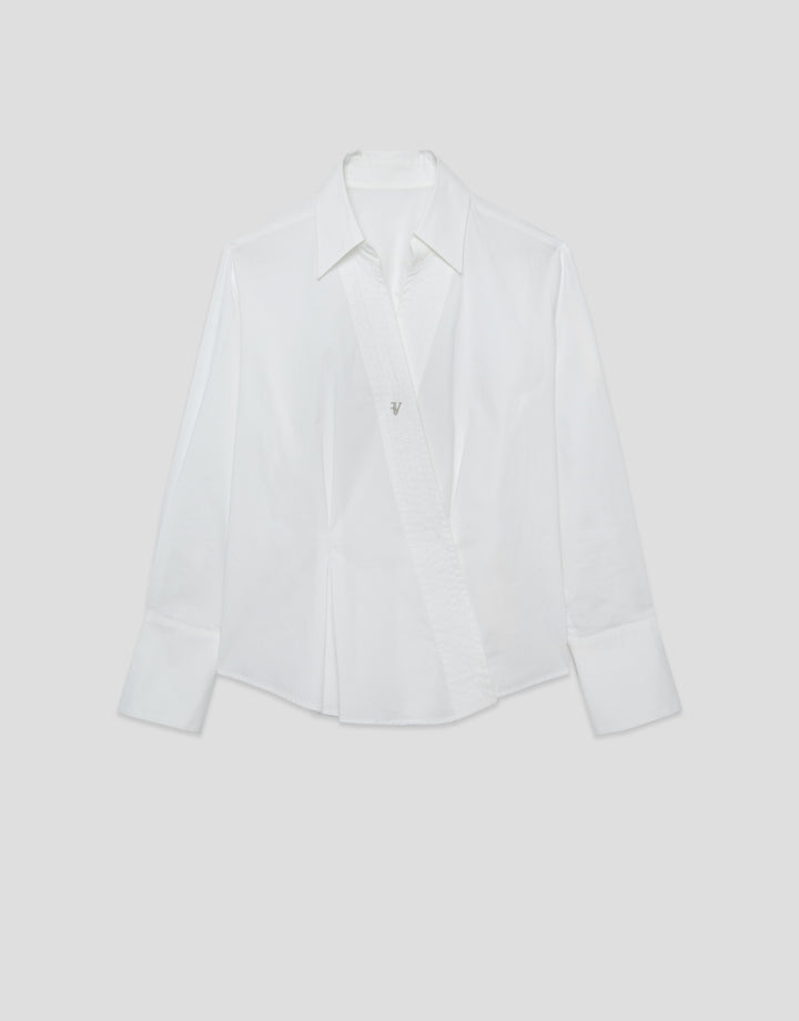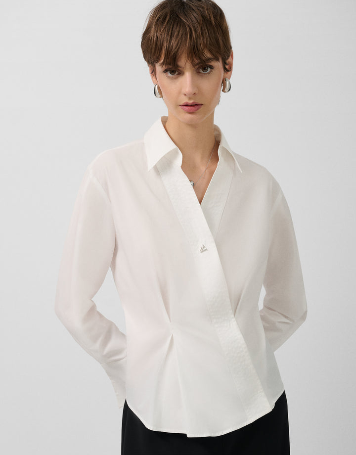 Description Long-sleeved shirt in white cotton with a crossover V-neck and topstitched trim. Shirt collar and long sleeves finished with wide cuffs. Composition 97% cotton 3% elastane Care Instructions Hand wash only, do not rub. Do not bleach. Maximum temperature 150ºC. Dry clean with perchloroethylene. Do not tumble dry.