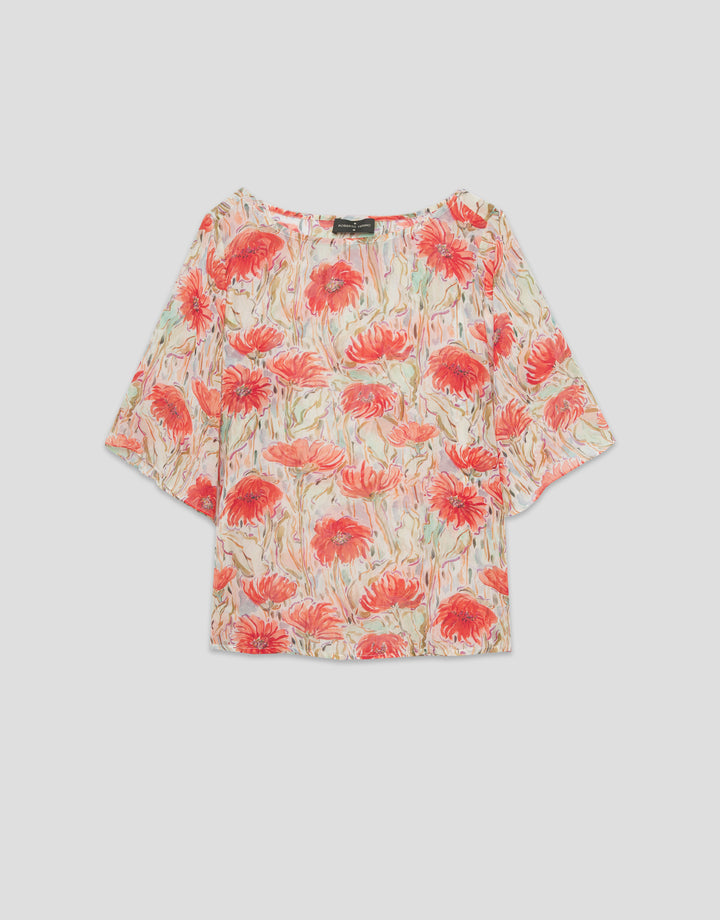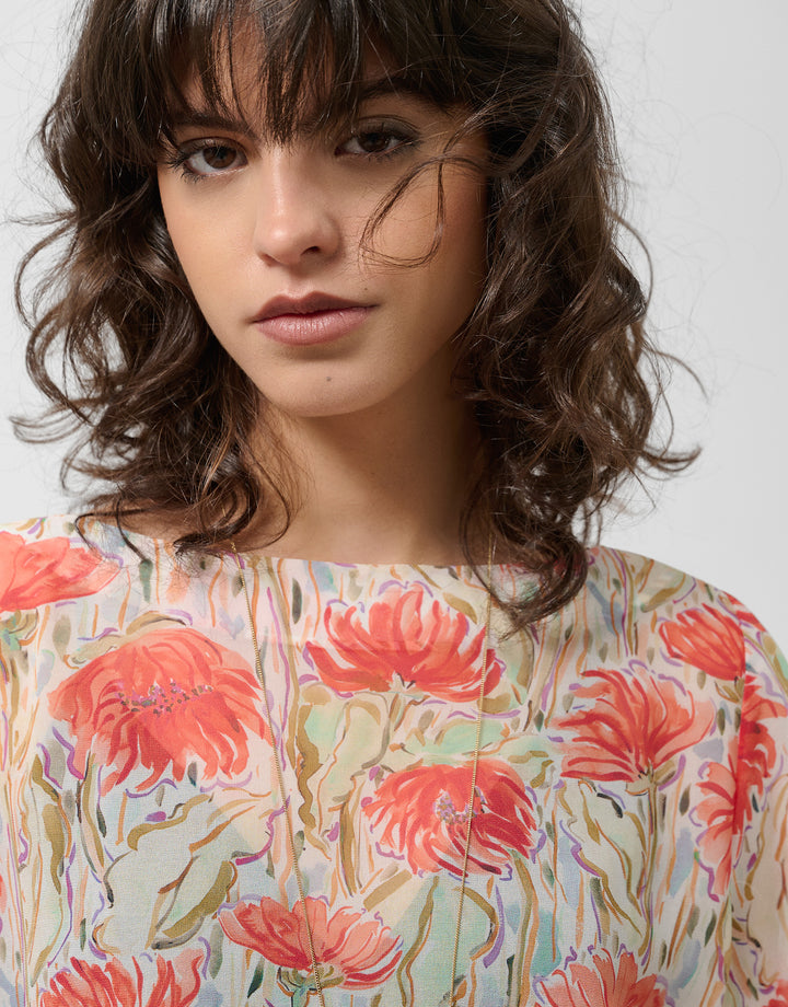Three-quarter-sleeved blouse in lightweight chiffon with a coral and red floral print. Bateau neckline and hem with side slits.