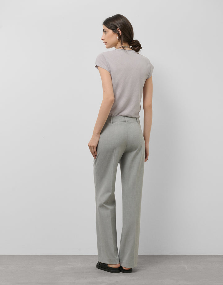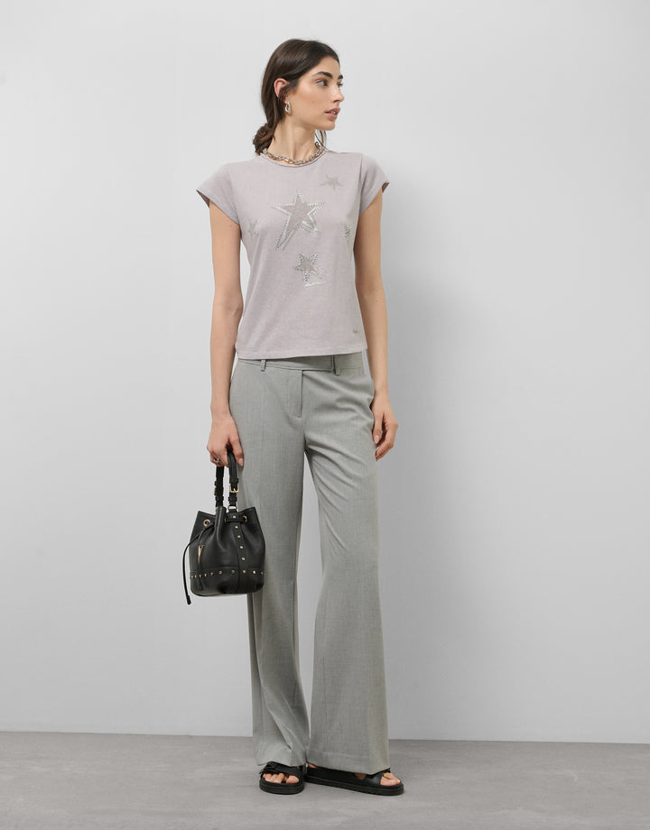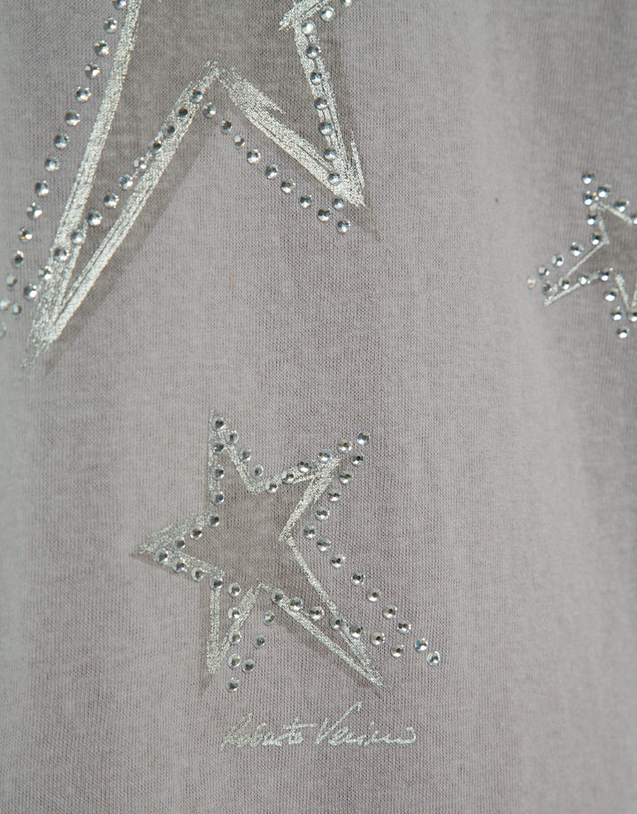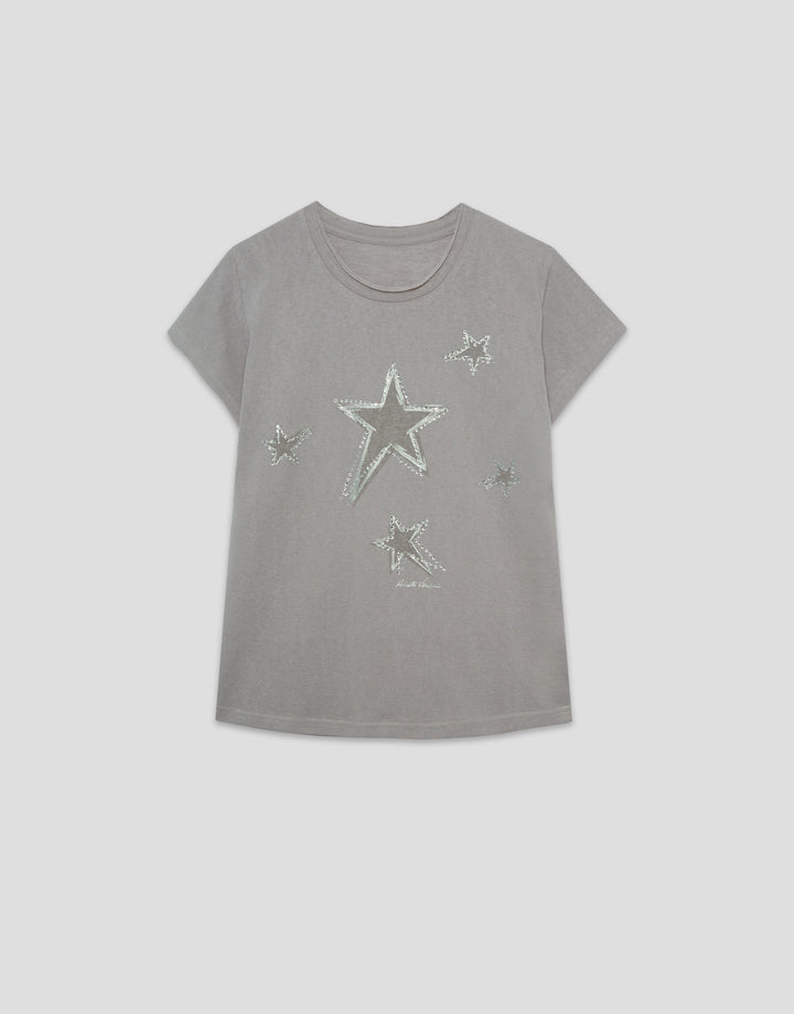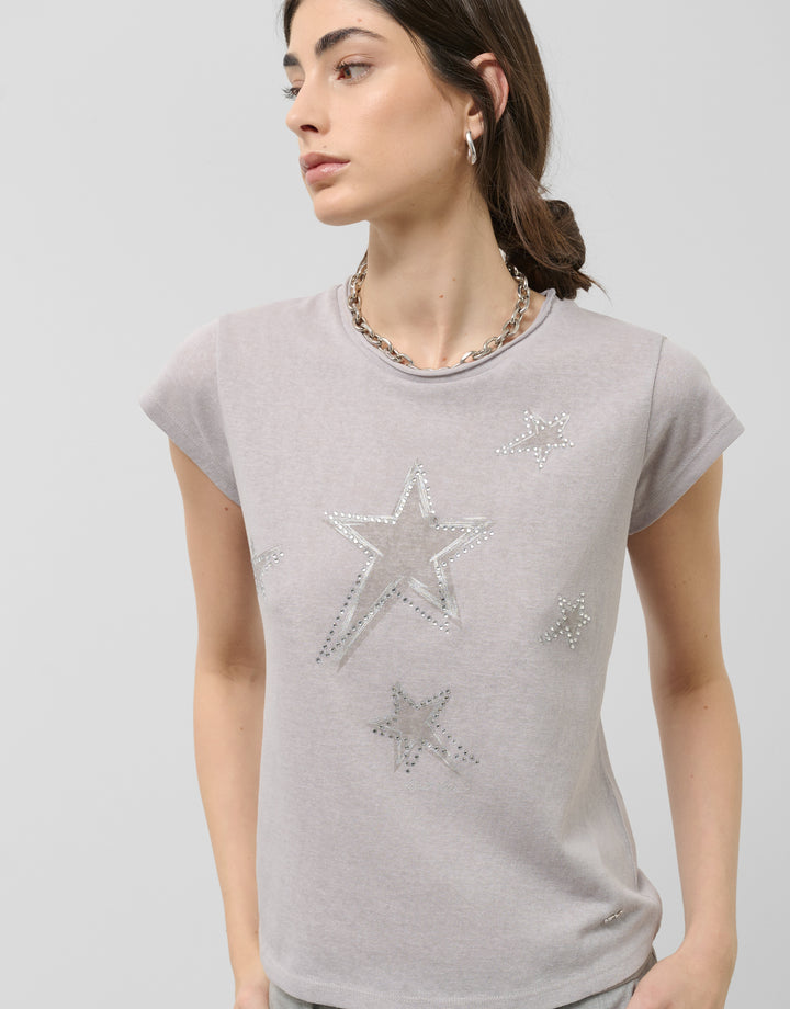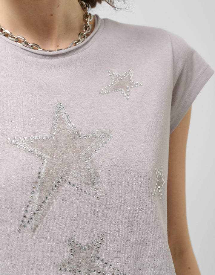 Short-sleeved T-shirt with an unstitched round neckline in a lightweight knit with a front silver star print and stone appliqués.