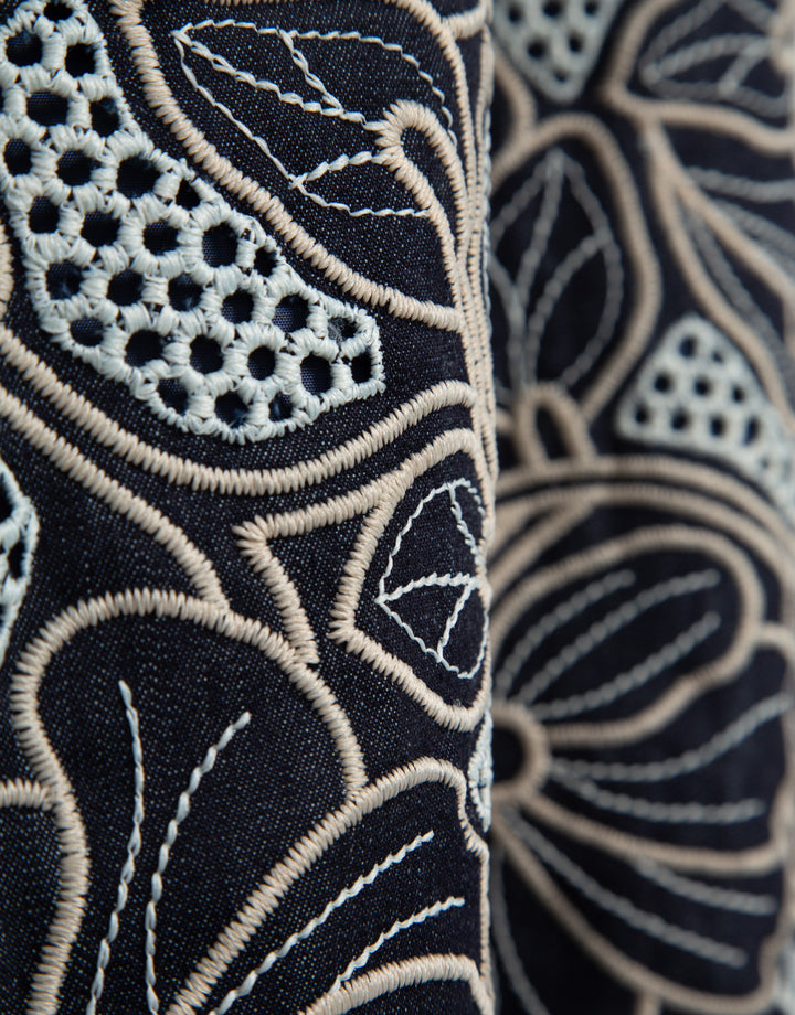 Midi Dress With Straps In Blue Denim Fabric With Floral Embroidery And Openwork