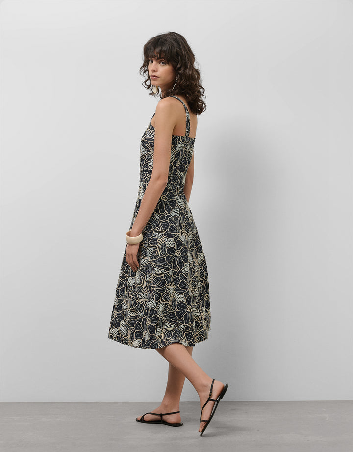 Armhole midi dress in blue denim with camel and white floral embroidery and white embroidered lacework. Straight neckline, fitted bodice with inset waistband, and slightly flared skirt. Invisible side zipper closure.
