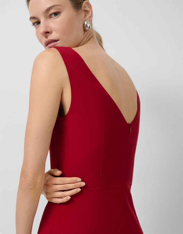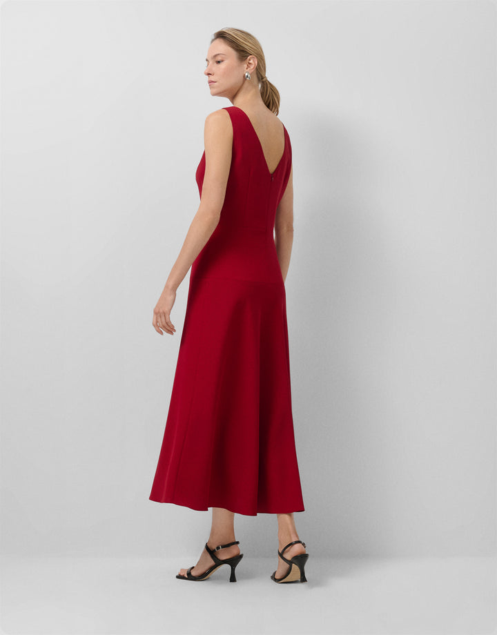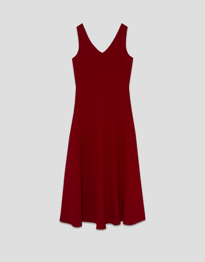 Red crepe midi dress. V-neck front and back, fitted bodice with sewn-in waist seams and flared skirt. Concealed side zip fastening.