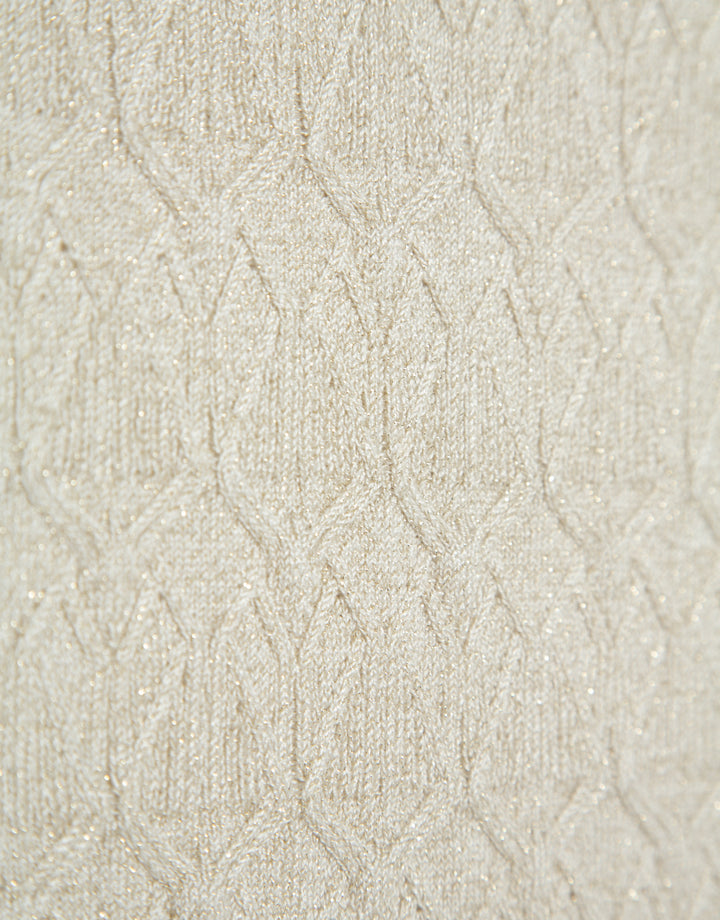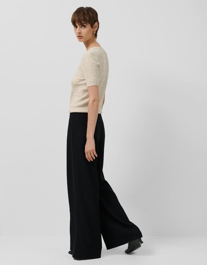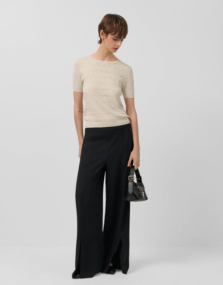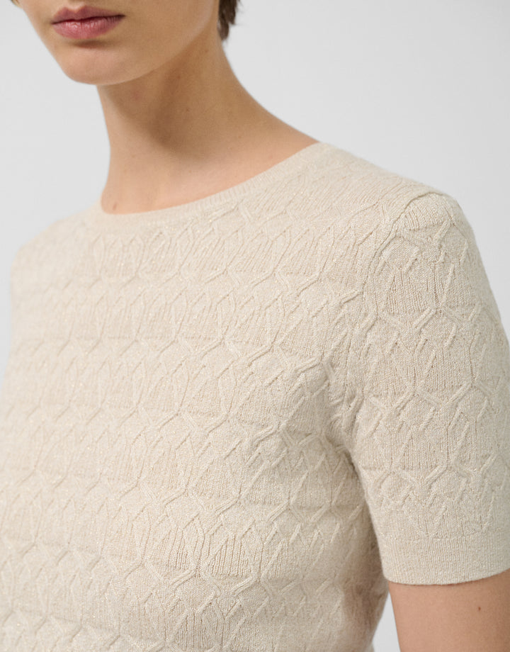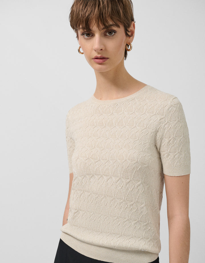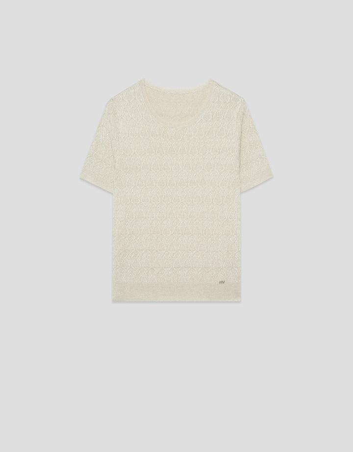 Description Short-sleeved, round-neck t-shirt in fine gauge wool knit with beige pattern and elastic ribbed trim. Composition 85% viscose 8% polyester 7% metallic fiber Care Instructions Hand wash only, do not rub. Do not bleach. Maximum temperature 110ºC. Do not dry clean. Do not tumble dry.
