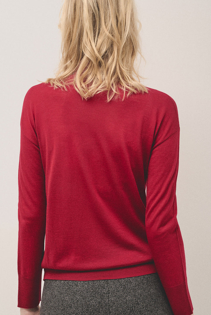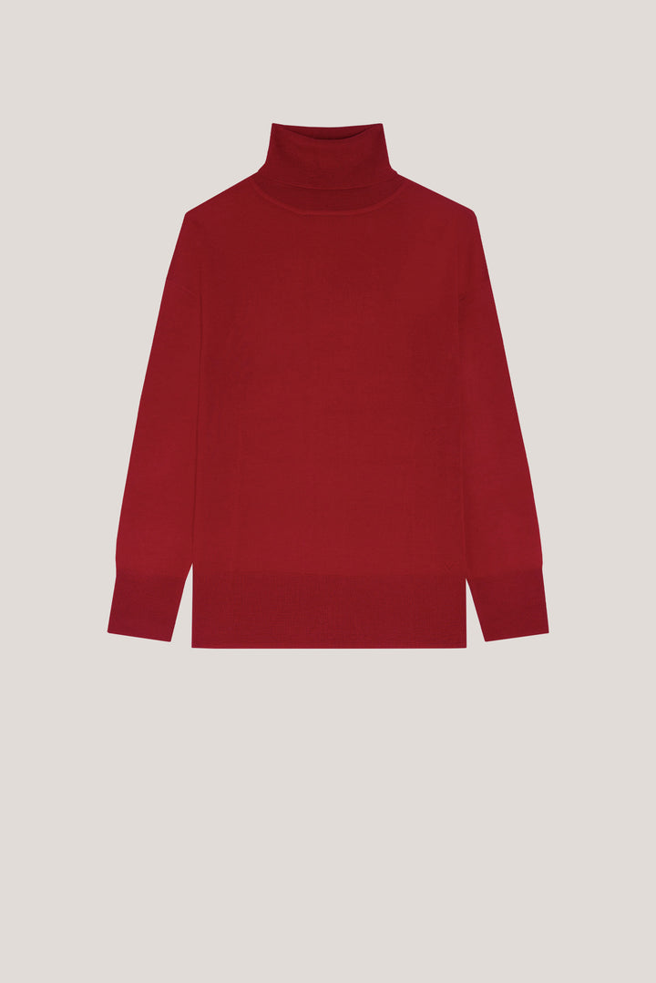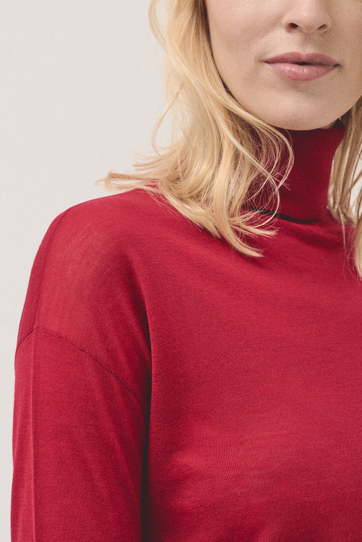 Red fine wool knitted jumper with turtleneck and long sleeves. Thin ribbed trim.
