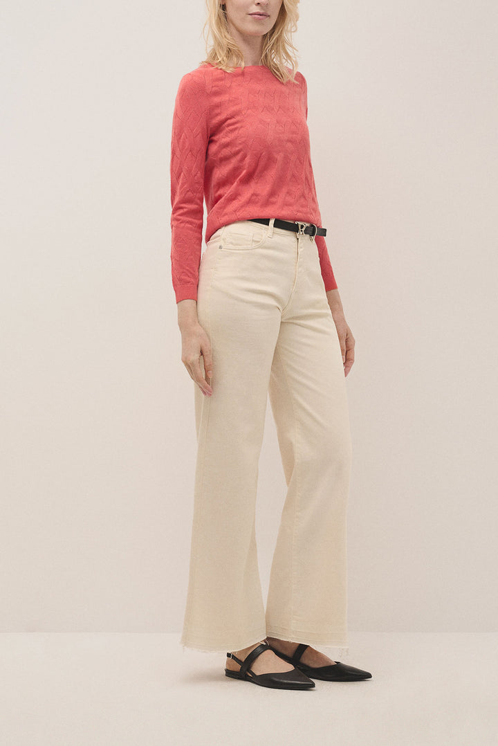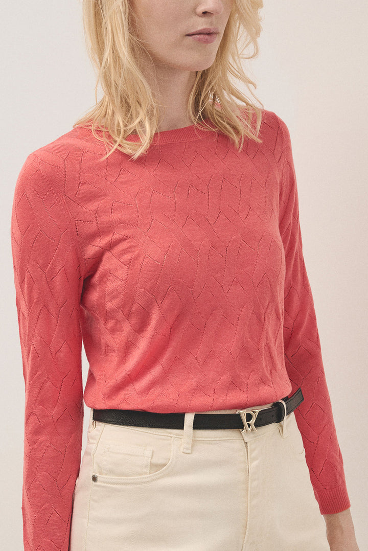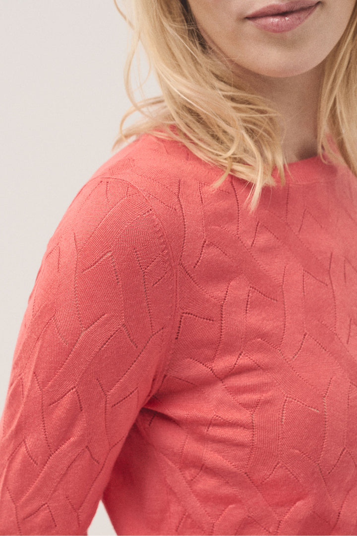 Long sleeve knitted jumper in orange woollen cross knitting design. Boat neckline and ribbed trim finishing.