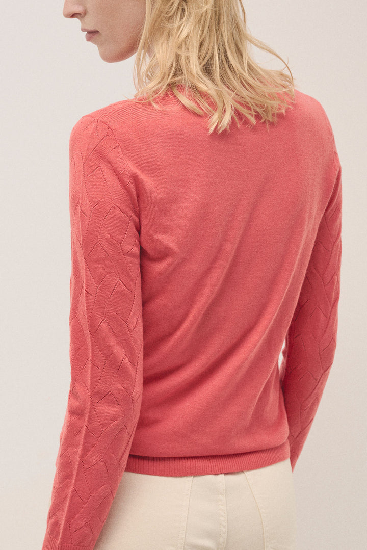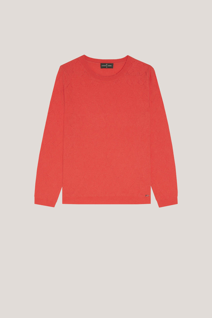 Description Long sleeve knitted jumper in orange woollen cross knitting design. Boat neckline and ribbed trim finishing. Composition COMPOSITION CLOTH: 100% Wool CARE INSTRUCTIONS: Hand wash, do not rub. Do not bleach. Iron at Low temperature: 110°C. Do not dry clean. You can not tumble dry