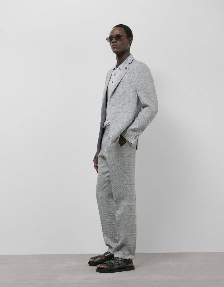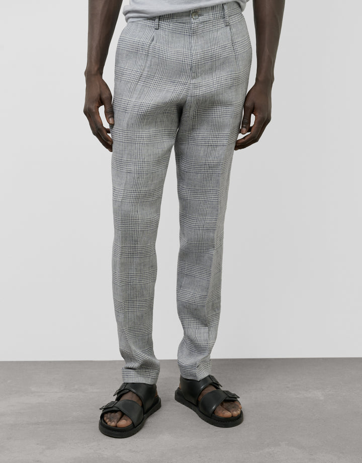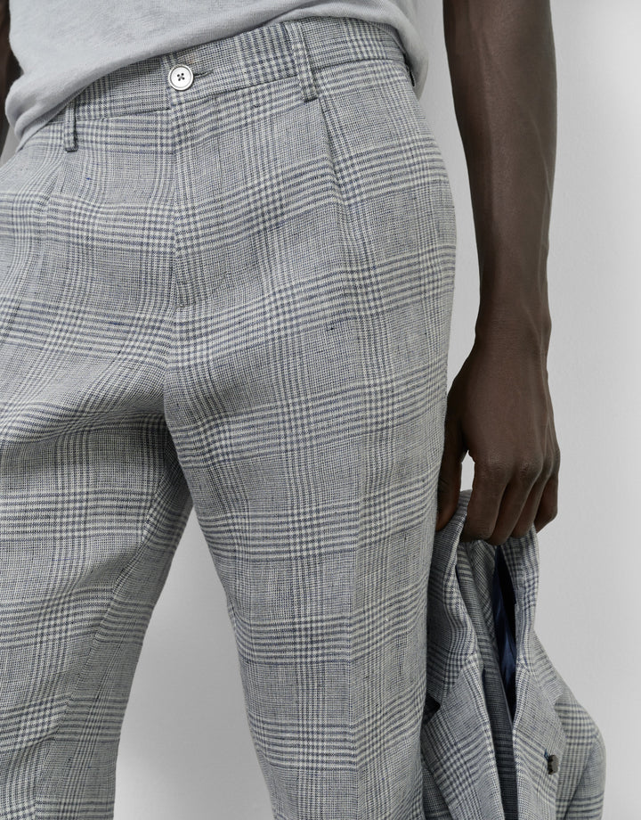 Regular-fit trousers made from a blue and gray checked linen fabric. Front pleats, a French pocket on the front, and welt pockets on the back.