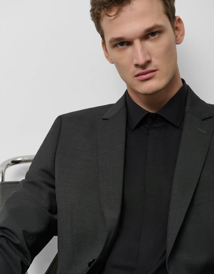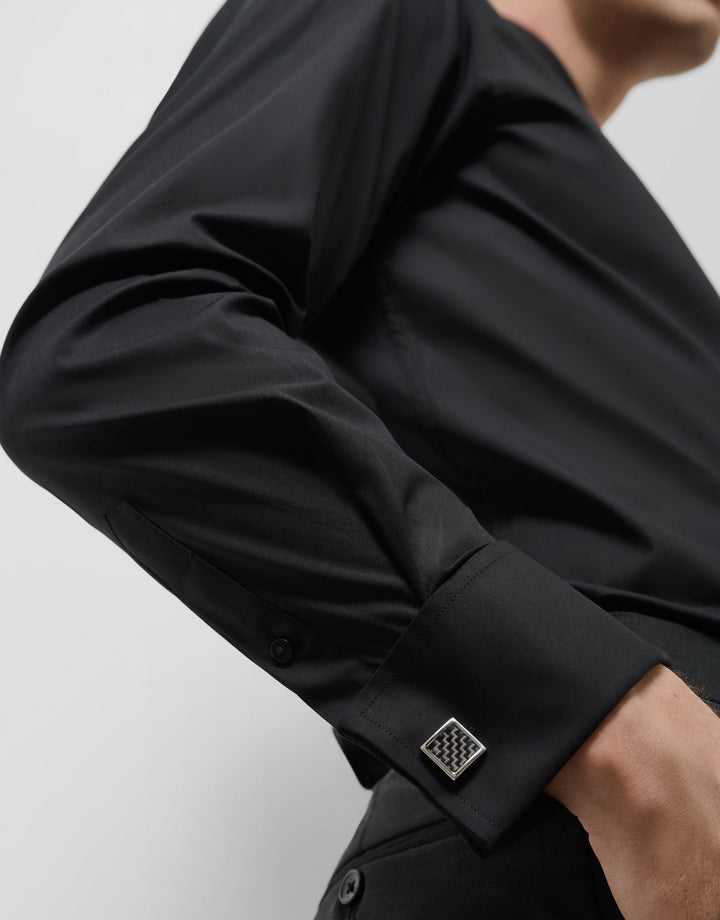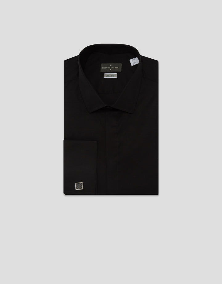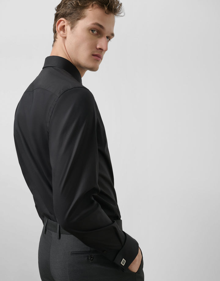 Dress shirt made of black cotton elastane. Slim fit, English collar, concealed button closure, and long sleeves with double cuffs and cufflinks.