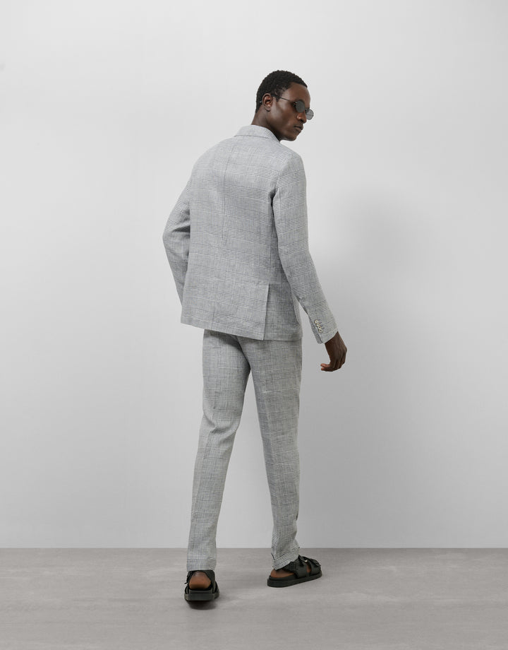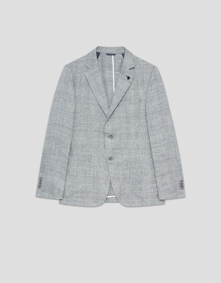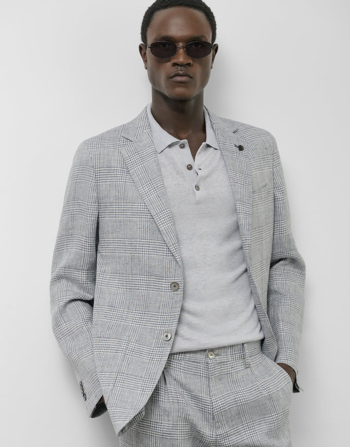 Unstructured linen blazer with a gray and blue checkered pattern. Two-button closure, two patch pockets, one inset at the chest, and vents at the back.