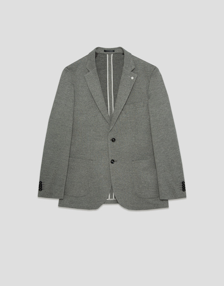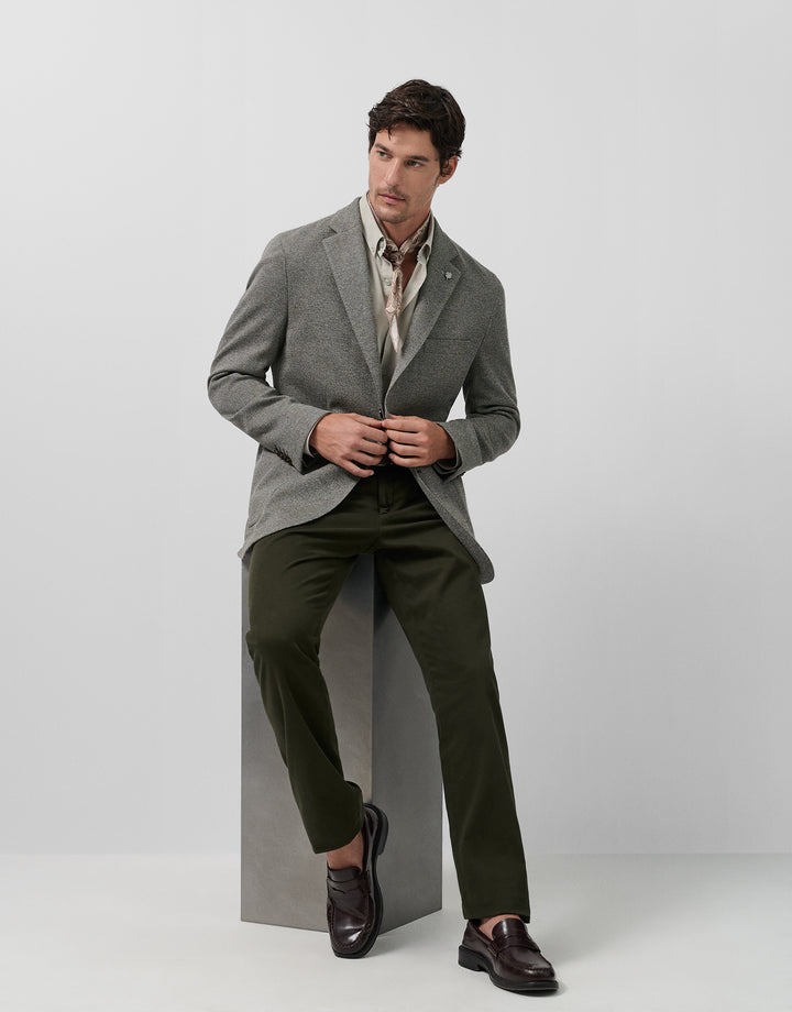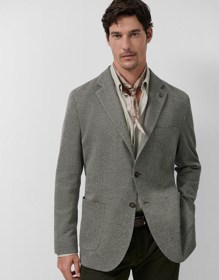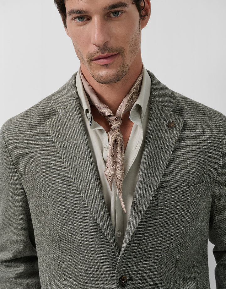 Description Unstructured comfort blazer in a khaki-green and ecru blend cotton blend. Two-button closure, two patch pockets, one inset at the chest, and vents at the back. Care Instructions Do not wash. Do not bleach. Maximum temperature 110°C. Dry clean with perchloroethylene. Do not tumble dry.