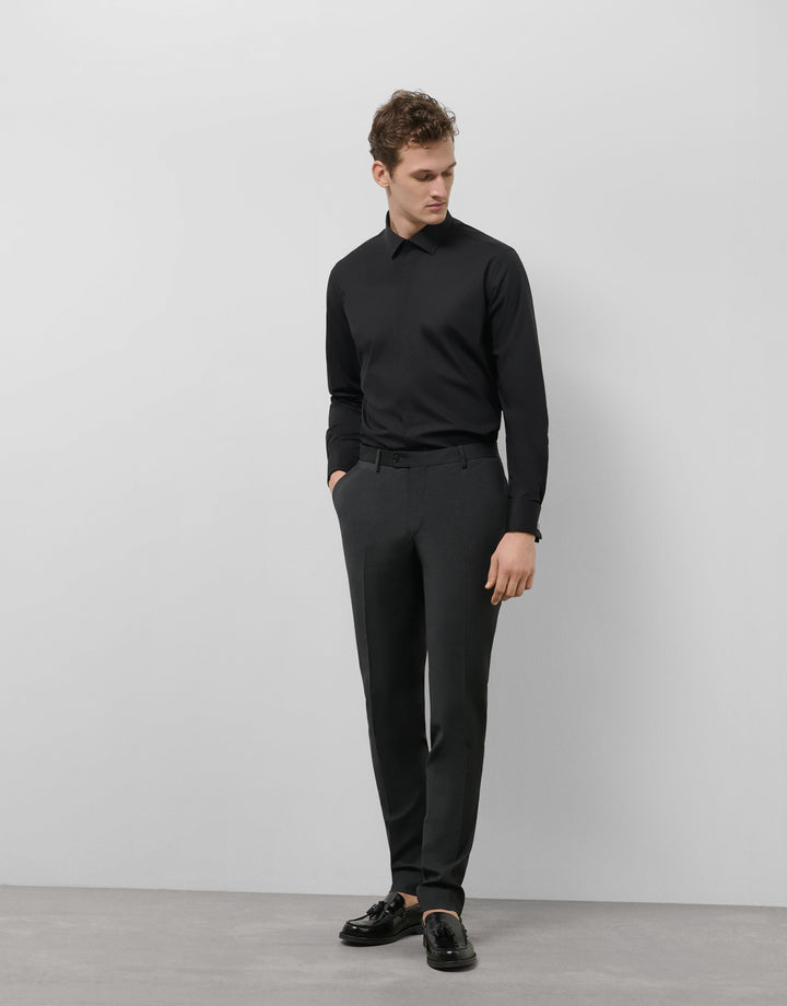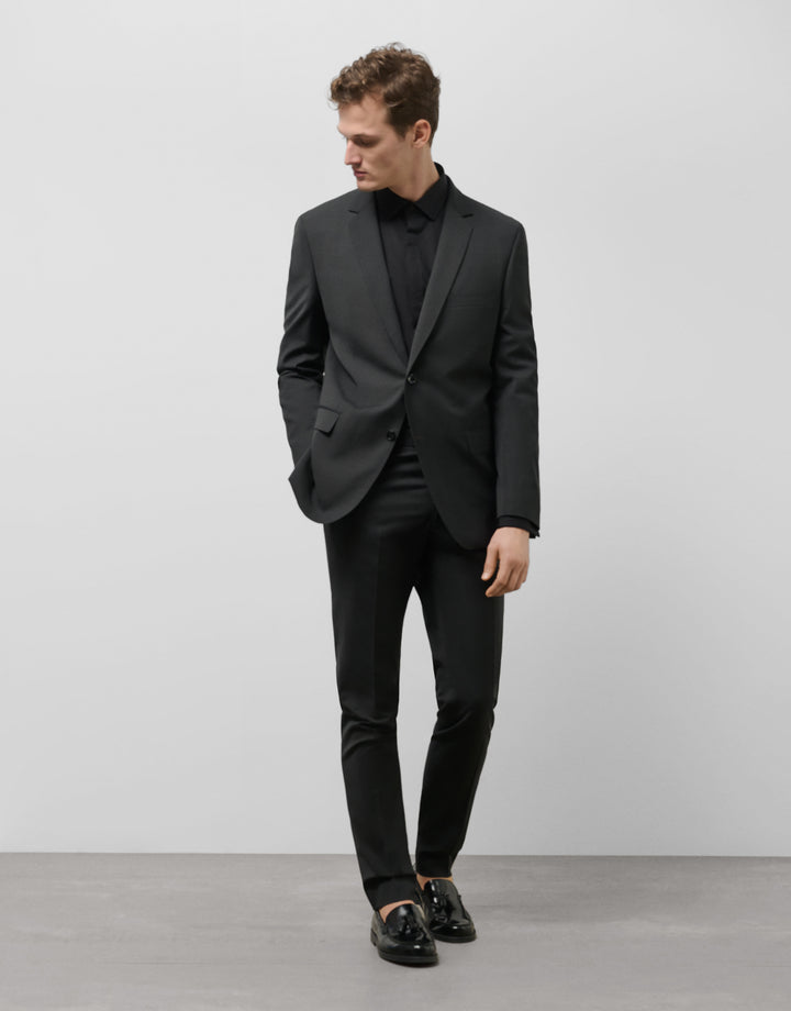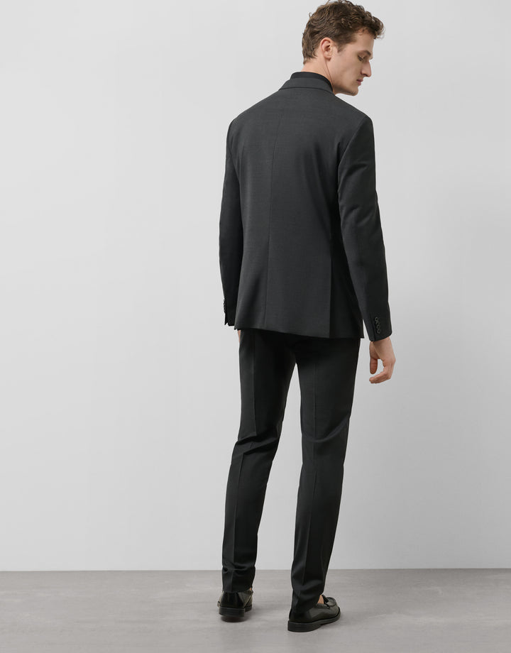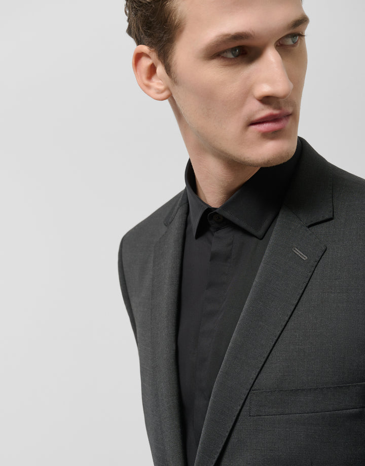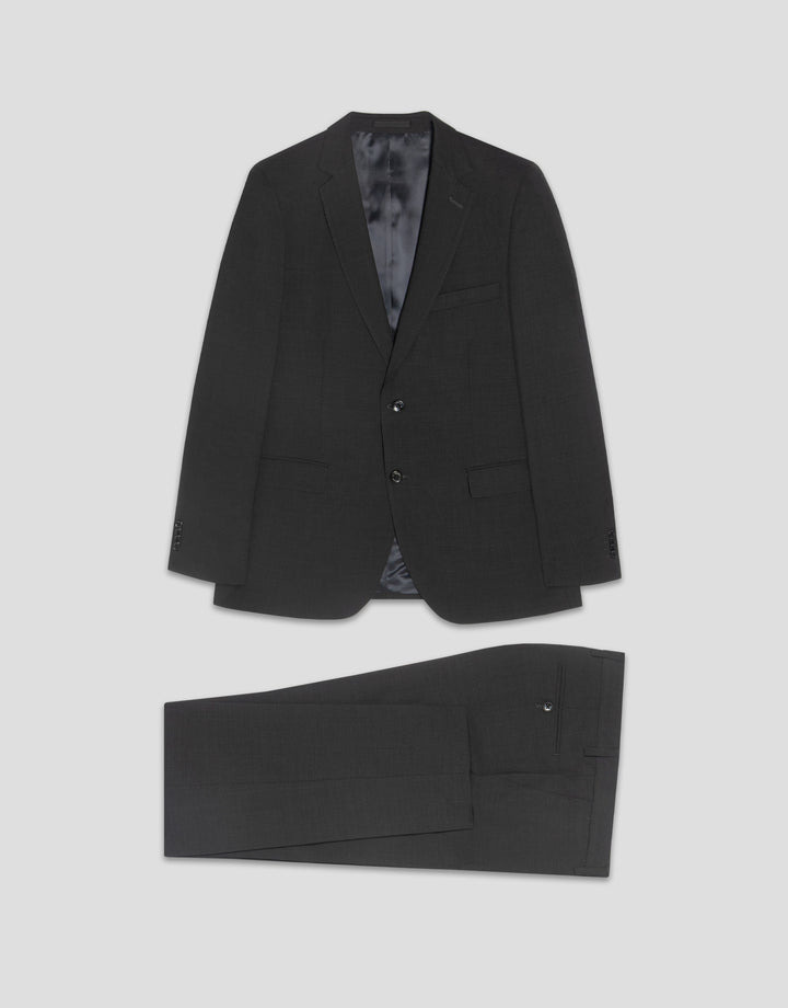 Slim-fit half-canvas suit made from a plain dark gray wool blend. Classic-cut trousers and a jacket with two flap pockets and one inset chest pocket. Two-button closure and double vent at the back.