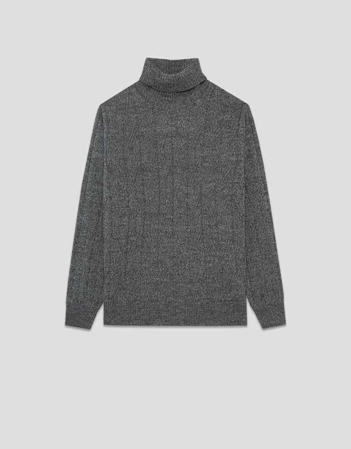 Sweater made from a dark gray melange wool blend with a patterned design. High neck, long sleeves, and a personalized metal plate at the hem. Thoughtfully made in Italy, where tradition meets impeccable quality.