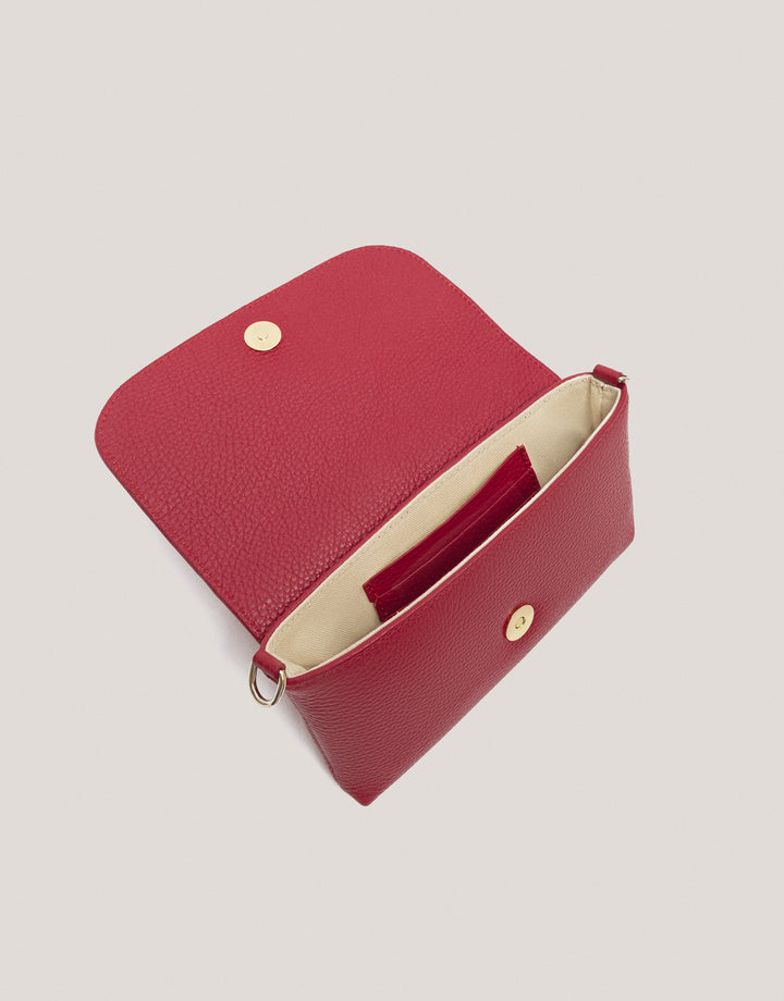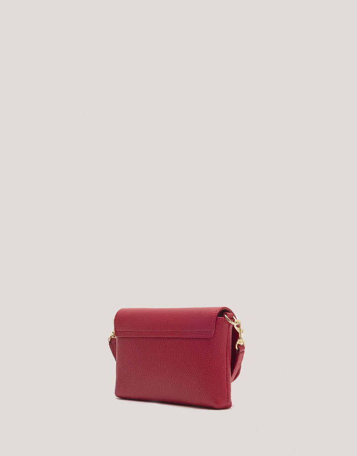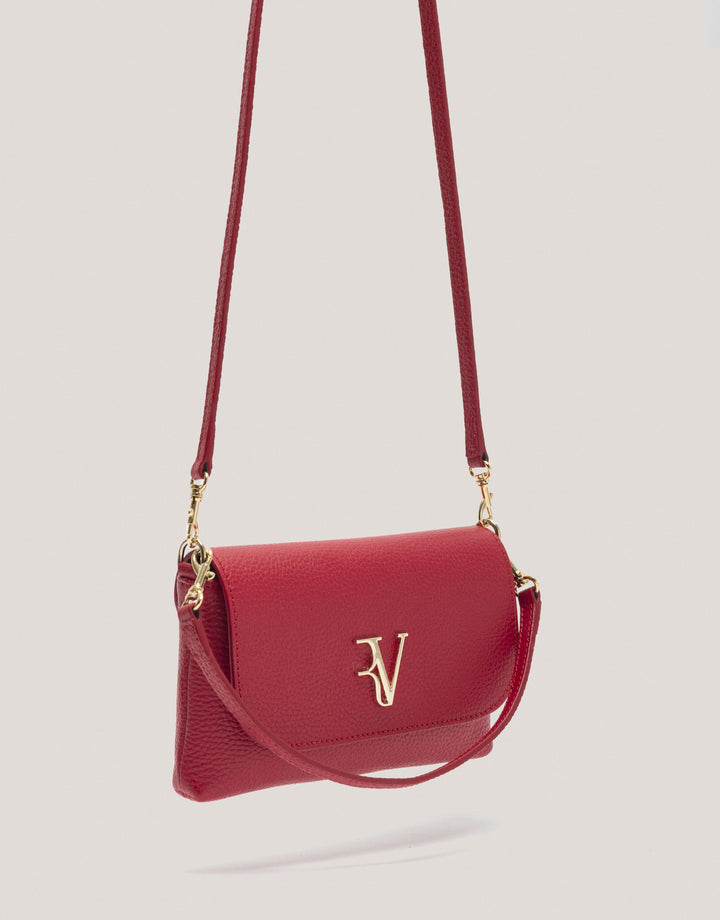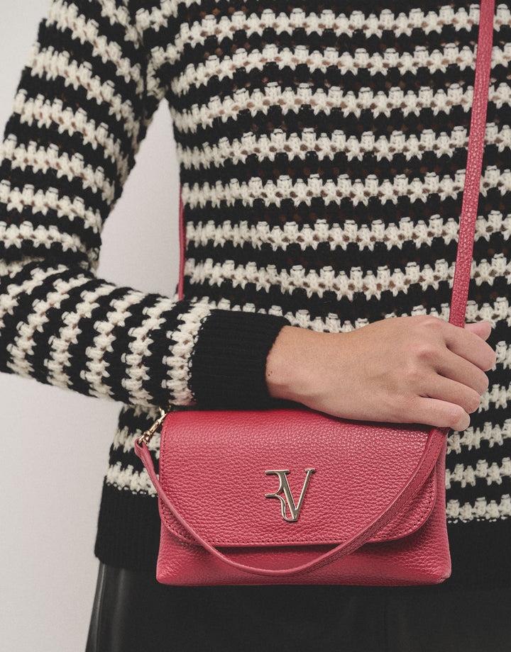 Lavendar, granulated leather, mini handbag with detachable handle and shoulder strap. Flap with metallic RV logo, clip closure and interior lining and compartments with card-holder pocket. Light gold metallic fixings. Handle 1 cm wide and 17 cm high and shoulder strap 1 cm wide and 119 cm long. Approximate size: 20 x 11 x 3 cm.